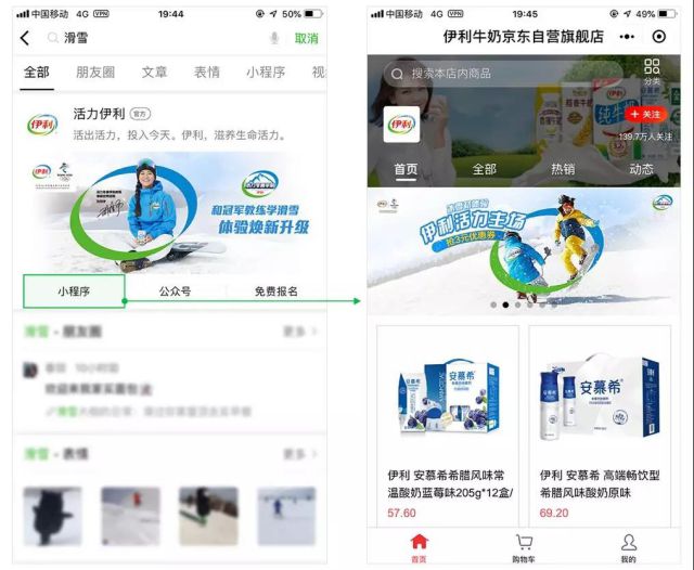 仅在12月3日当天,该广告总曝光量近8000万,显著提升了活力冬奥学院的社交曝光与声量。 创建微信品牌官方区,沉淀品牌价值 在上线朋友圈广告的同时,伊利也同步上线了微信品牌官方区,成为快消行业第一个尝鲜微信品牌官方区的品牌。 用户只要在“搜一搜”打出“滑雪”“伊利”“活力冬奥学院”等关键词,便可触达伊利的品牌官方区。伊利品牌官方区聚合了小程序、公众号与朋友圈广告原生落地页三大版块,用户可通过页面选择购买产品、了解品牌信息或者报名滑雪活动。 伊利品牌官方区示意图 不同于朋友圈广告的大曝光功能,品牌官方区是品牌持续沉淀价值的阵地,是品牌和用户沟通的新窗口。它可以让品牌直接展示在搜索下的专属区域,一来帮助用户在搜索品牌时,能更快、更直接地获取品牌信息和服务,放大品牌的自然流量价值;二来帮助品牌在微信搜索里建立专业品牌形象,强化用户对其认知,实现更长远、更丰富和更立体的营销价值。 当下正逢雪季,滑雪俨然成了朋友圈的热门话题。为了收割精准流量,此次伊利除了将自身品牌及活动名称作为搜一搜的关键词外,还抢占了“滑雪”这一极具时效性的IP热词(这也是快消行业在“搜一搜”尝试的第一个IP类词),将那些有滑雪计划或兴趣的目标用户引导至其品牌官方区,继而了解活力冬奥学院的报名活动。 此外,伊利品牌官方区首次打通了京东开普勒小程序。用户点击小程序,即可进入伊利京东自营旗舰店购买商品。这对于品牌而言,极大地降低了开发和运营成本,实现了多渠道资源的高效整合。