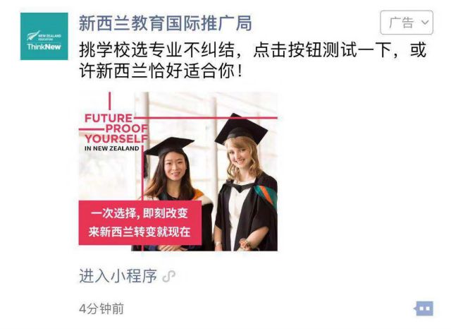 最近好像大家都在微信里做起了小程序推广,第一次是尚德机构,随后是维意定制,今天小编跟大家分享新西兰教育国际推广局投放的留学广告,也是关于小程序推广的哟~