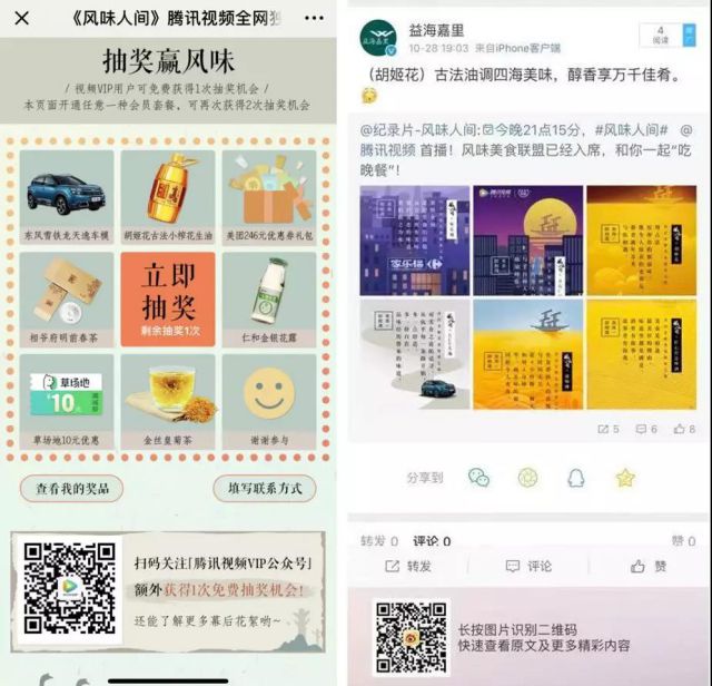 值得一提的是,胡姬花还成功借势了腾讯大生态下的站内推广资源,比如,胡姬花全程参与了“《风味人间》腾讯视频VIP抽奖赢风味”、“风味晚宴”等腾讯内部推广活动;母公司益海嘉里官微还与《风味人间》官微就美食联盟活动进行微博互动等,通过与平台方的整体营销联动放大了品牌影响力。