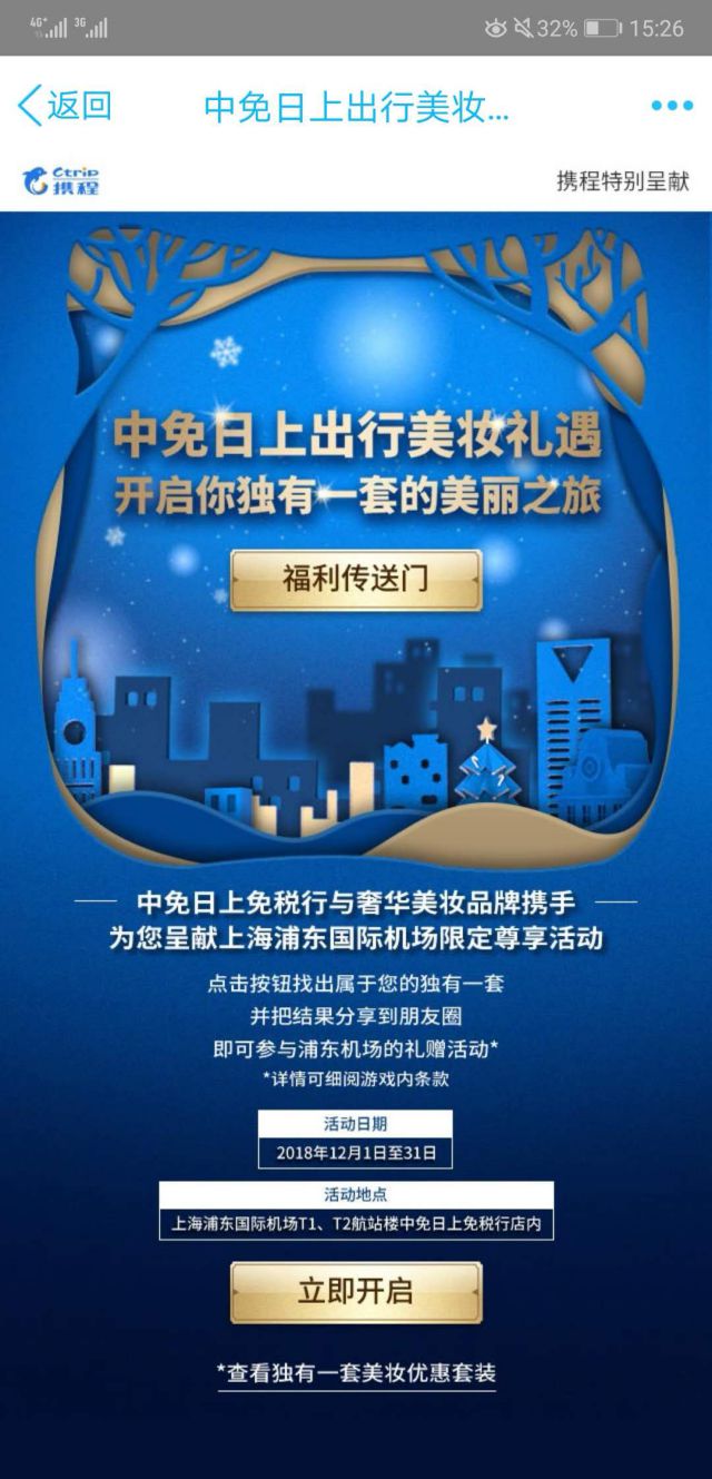 无论是谁做推广,肯定有个推广主题。 这次携程的推广主题就是关于中免日上出行美妆礼遇。 广告创意图片以蓝色为基调,蓝色是我喜欢的颜色,广告也是我喜欢的广告哈哈哈。 我们点击广告,查看落地页!