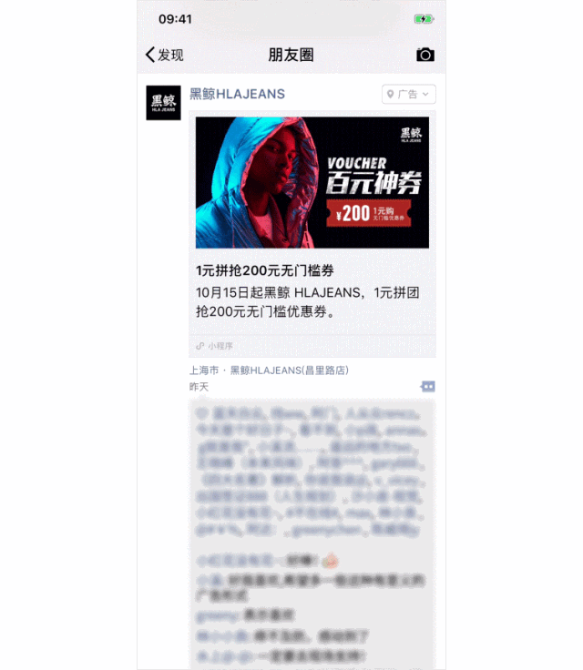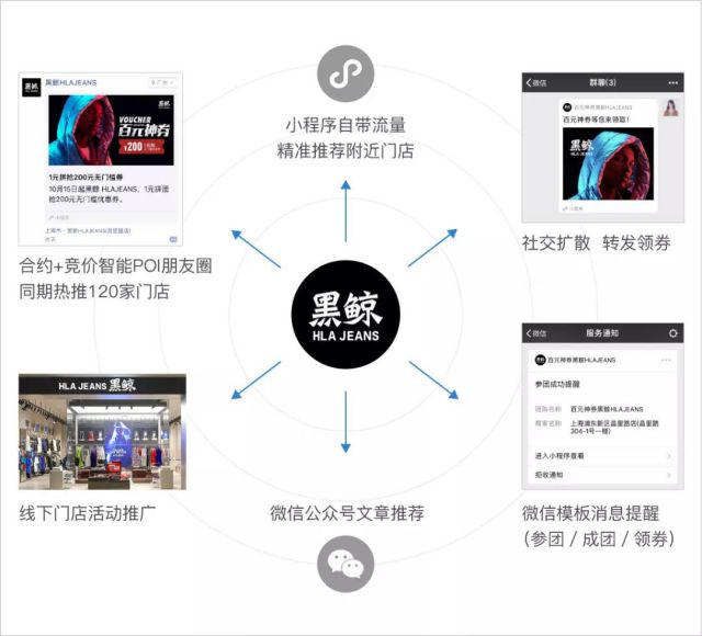 从种子用户到社交裂变,全渠道推广实现消费者最大化触达 黑鲸 HLAJEANS拼团小程序首先通过基于LBS技术精准推荐的朋友圈广告与公众号图文带来了大批种子用户,并在不同渠道获得推广扩散,最大范围触达消费者。