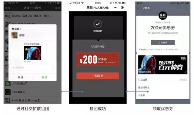 在腾讯智慧零售的支持下,黑鲸 HLAJEANS开发拼团小程序——黑鲸 HLAJEANS百元神券,一个月内快速上线,鼓励消费者通过小程序拼团领券,并给出极具吸引力的无门槛代金券。消费者在微信轻松分享给好友或群,在拼团成功后授权微信登陆小程序,领取卡券,小程序基于用户位置信息自动推荐附近三家门店,引导到门店购买进行核销。