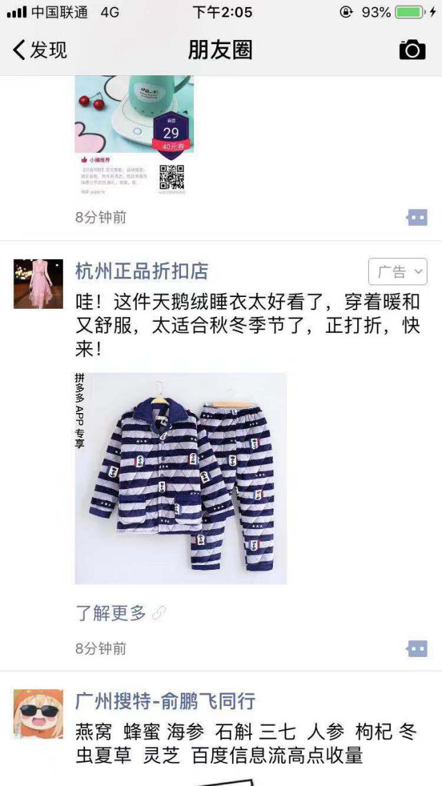 广告案例如上图,广告创意是从鹅绒什么叫信息流吗睡衣打折来出发,吸引用户查看广告! 广告图片中呈现的睡衣看起来还是很保暖的,至于具体如何,只有买回来开箱测评了~ 还记的小编说广告主还是拼多多吗?在广告图片左上角就有展现。只有通过拼多多APP进行购买才能有大额优惠哟~ 点击广告以后,会进入睡衣产品购买页,可以看到产品信息,也能够看到用户评论,但是如果想要购买产品,还是需要下载拼多多APP才可以进行的! 如果大家也想要通过微信朋友圈广告做APP下载的广告,那么你就要通过APP本身的内容和APP本身的功能型出发,告诉用户APP能帮助解决什么问题,只要用户对于这个APP有需要,又看到了AP尼尔森市场研究有限公司P的功能型,下载的机会也会大大增加!