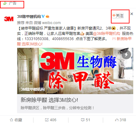 新房装修一般要等到2-3年以后才能入住,这么做的原因就是为了排除甲醛(甲醛是一种有毒物质,主要是对皮肤粘膜有刺激作用,室内甲醛超标以后,就会引起眼红、眼痒、咽喉不适等症状,严重者也可能UI引起咽喉灼烧痛,呼吸困难等等,所以新房装修后,一定要多多通风)。 今天小编要跟大家分享的微博广告案例就是关于如何去除甲醛的! 广告主是3M除甲醛机构,广告主能够为大家提供的服务和解决的问题就是除甲醛! 选择的广告资源是微博粉丝通信息流广告~一起来看看案例吧!