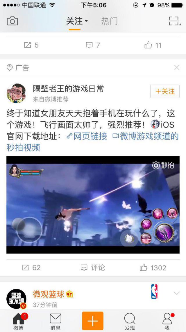 有了男/女朋友以后,会经常出现这样的画面:其中一人闲的无聊,另一人游戏打得超开心。两人也是因为游戏这个事情发生争吵,为了游戏分手的情侣也不在少数。 能够投放游戏广告的平台不在少数,比如今日头条、微信朋友圈、爱奇艺、快手、抖音等等。今天小编要跟大家分享的游戏就是在微博投放的! 广告主是隔壁老王,隔壁老王会悄悄告诉你,女友最近都在玩什么游戏!(斜眼笑,隔壁老王有女朋友了)