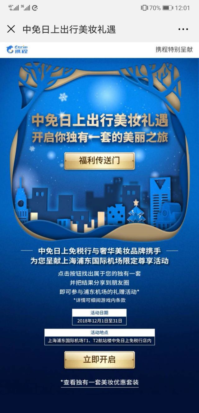 活动文案都没变,都是一样的,“携程特别呈现中免日上出行美妆礼遇,开启你独有一淘的美丽之旅”。 然后是广告文案的主题海报! 点击广告图片仅是把图片放大,广告图片不会挑战落地页哟。 小编对于广案例的原则是能够产生点击行为,就一定会去点击试试,所以还是点击了“了解更多”,想要看看点击以后会有何惊喜!
