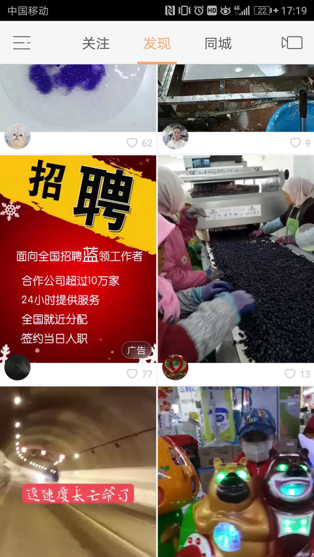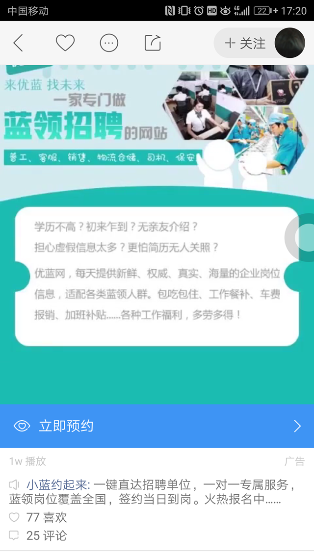 招聘平台常见的推广渠道就是微博、、趣头条等等,今天小编在快手上也看到招聘广告啦,广告来源就是优蓝招聘。 优蓝是中国下载量排名第一的蓝领招聘APP(根据HRoot人力资源管理类APP下载量排名),是中国蓝领招聘垂直服务移动互联网平台的先行者,优蓝网是依托线下覆盖的百余家门店,来给求职者提供10万代运营企业+岗位。 这次广告主选择的是快手信息流广告,就是在快手发现页第五位,广告视频在手机屏幕下方会有小兰条,通过点击广告即可下载APP或者是实现线上购买等等。