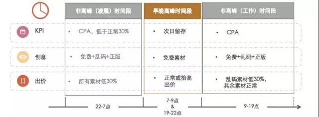 4、时段差异化出价,助力量级稳定提升 在投放信息流广告时,观察不同时间段的投放效果发现,早上7点至9点和晚上7点至10点为高峰高峰时间段,应当重点投放并关注次日留存情况,其余非高峰时间段关注CPA即可。