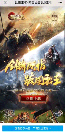 除了针对不同流量场景采用不同素材,乱世王者还为安卓用户定制了落地页,通过GIF图生动展示游戏内容,并突出“元宝”“将领”等新手礼包,推动本身就对游戏感兴趣的用户进一步形成转化。在安卓APP下载广告投放中,尤其针对安装包体较大的游戏来讲,优质的落地页可提升用户对游戏的兴趣,增加等待下载过程中的耐心,对于提升转化至关重要。 乱世王者安卓落地页