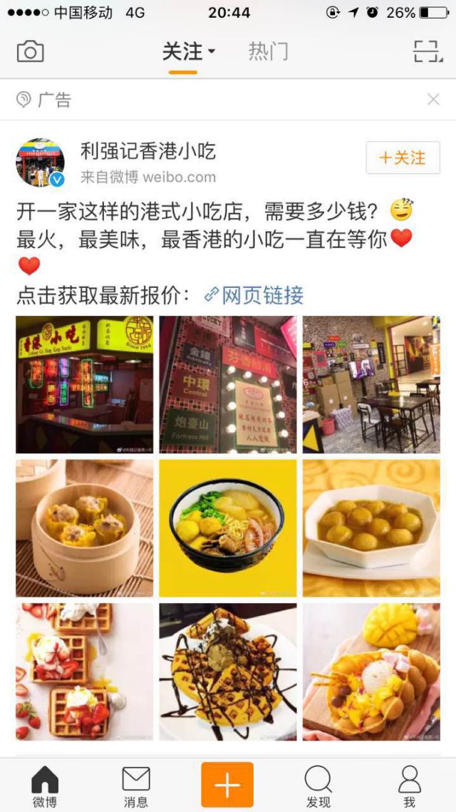 话不多说,我们进入正题,小编今天来跟大家讲讲利强记香港小吃是如何投放微博广告的!