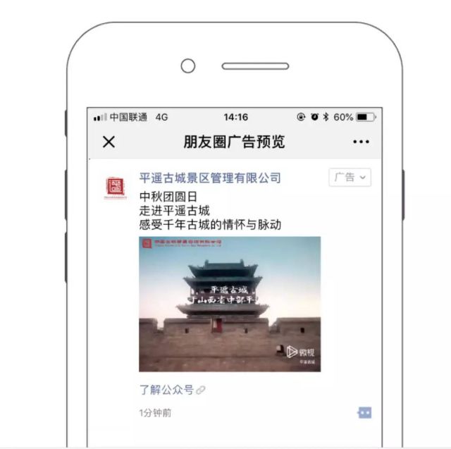外层文案以中秋、平遥、千年古城为主要展示点。以中秋节我对危机公关的认识假日来突出游客的时间自由,吸引有出游意向的用户关注;同时用感受千年古城情怀与脉动来突出景点特色,体现景区是一座历史古城,让人有“归根”之感。 外层视频以推镜头的方式,让视频展现形式犹如用户亲身走进古城一般,从俯瞰图、建筑细节、城内景区都能很好的展现古城特色,增加用户的观看体验效果。 本次微信投放是以品牌推广为主,来增加微信公众号的粉舆情行业丝数量。在外层文案、视频中都以经典特色为主进行展示介绍,落地页中主要以中秋活动,平遥古城重要景点为主介绍,来吸引用户关注。同时点击关注直接跳转公众号,可让用户查看公众号内容,丰富了解景点详情,增加用户到景点打卡几率。