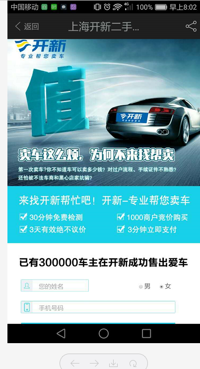 呐,最先开始的就是帮助广大朋友提出关于卖车的建议:“卖车这么烦,为何不来找帮麦”; 然后就是找到开心专业帮忙卖车,可以享受的四大服务:“30分钟免费检测”“3天有效绝不议价”“1000商户竞价购买”“3分钟立即支付”。 目前,已经有300000车主成功售出爱车,只要你愿意留下自己的联系方式,就会专业服务人员给你回电,并记录你的真实信息,帮您出售爱车!