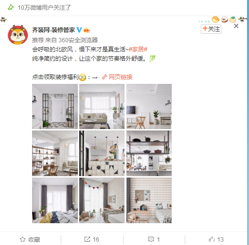 广告就是微博粉丝通信息流广告,由一段文字+九宫格图片+推广链接组成: 广告主品牌:齐装网 广告文案:真正能够让人感到温暖,有家的感觉的装修风格还是要数北欧风,北欧风风格就是纯净简约,能够让人倍感家的感觉。 广告国美危机公关咨询书亮点: 点击广告链接有装修福利! 广告优势: 1.微博九宫格图片会更适合品牌展现产品内容; 2.微博九宫格图文广告,能够给人一种舒适的用户体验,用户有需要可以通过点击链接进行咨询,暂时未有需求的用户也可以对装修进行简单了解; 3.微博粉丝通广告按照、CPM计费,广告效果转化较好,广告计费方式灵活,广告的展现方式多样化,是广告主做的不二选择。