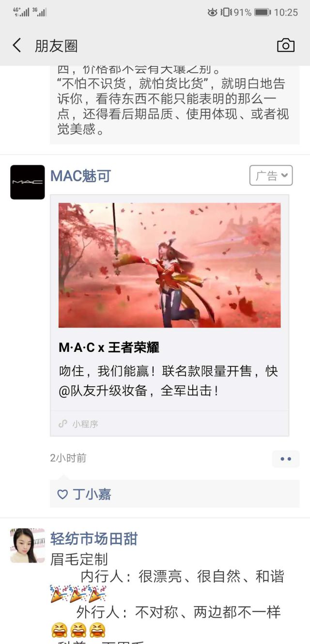 啦啦啦,从广告文案中可以直接看出广告主投放微信朋友圈广告的目的是让大家知道MAC联合王者荣耀出了联名款限量款口红! 点击广告以后,我们就活动邀约媒体费用可以进入MAC的小程序啦!
