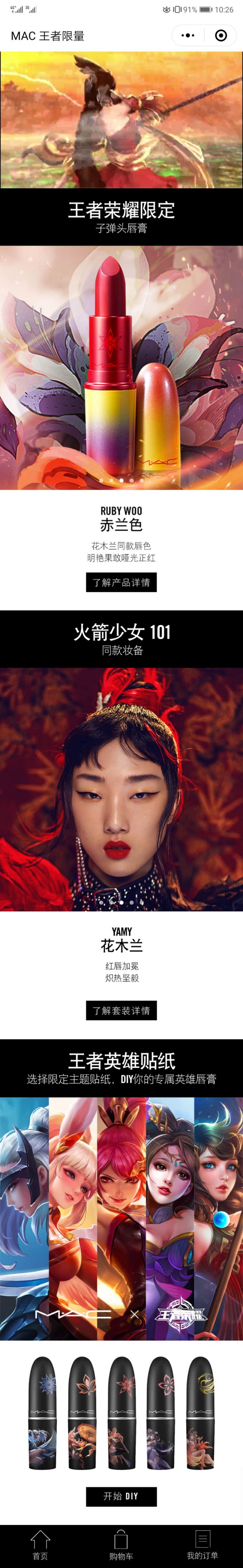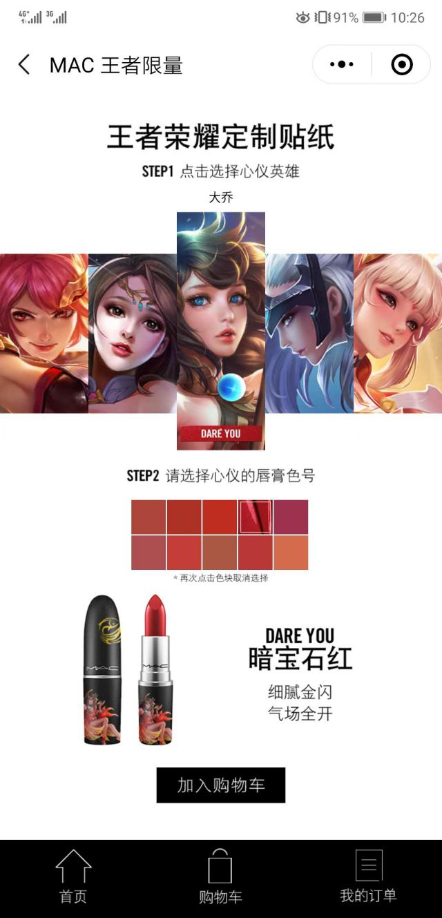 开始的时候就是视频,有动漫也有真人扮演的女性英雄,视频里的五大英雄包括花木兰,貂蝉、大乔、露娜、公孙离,除了有这些以外,还有不同的英雄贴纸,选择自己喜欢的贴纸,就可以DIY自己的专属英雄唇膏啦! 了解产品详情,就会进入产品购买页: