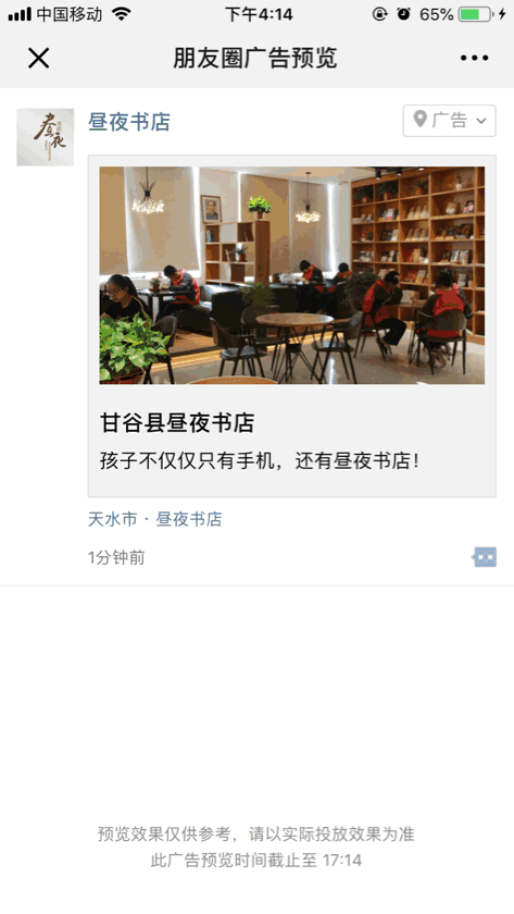 今天小编跟大家分享的微信案例是昼夜书店的! 昼夜书店集阅读、文具、咖啡、托管及书法、美术培训等为一体,其经营模式颠覆传统书店。为打开昼夜书店在天水市甘谷县的市场,选择以基础式卡片广告在门店5km范围内进行投放。
