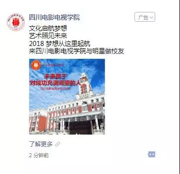 学校简介 四川电影电视学院是经教育部批准,继北京电影学院之后国内第二所以电影命名的全日制本科艺术院校。学院前身为1992年始建的四川师范大学电影电视学院。26年来为包括中央电视台在内的各级电视台输送了万余名影视专业人才,被誉为“中国影视人才四大培养基地之一”。 客户难题 高校数量逐年增加,专业的选择越来越多,所以需要加大学校的宣传推广,提升学校知名度,传统电视媒体广告费用大、宣传力度不够,且所覆盖的人群多为中老年人,人群范围较窄,所以在宣传上很难达到预期。 背景分析 四川电影电视学院在专业上是有一定优势的,近年来明星效应的现象越来越普遍,可以很有效的吸引大部分学生的关注,因此在招生季利用合适的方式进行宣传,以学校的环境和知名明星进行宣传学校、引导用户,是比较合适的选择,主动展现,加深用户记忆,提升学校知名度。 在广告投放设置上:利用朋友圈的精准定向特性,选择最合适的危机公关分析视觉中国时间区域、年龄、姓名、兴趣爱好等进行精准投放,利用好每一个曝光,提升广告效果。 外层展示