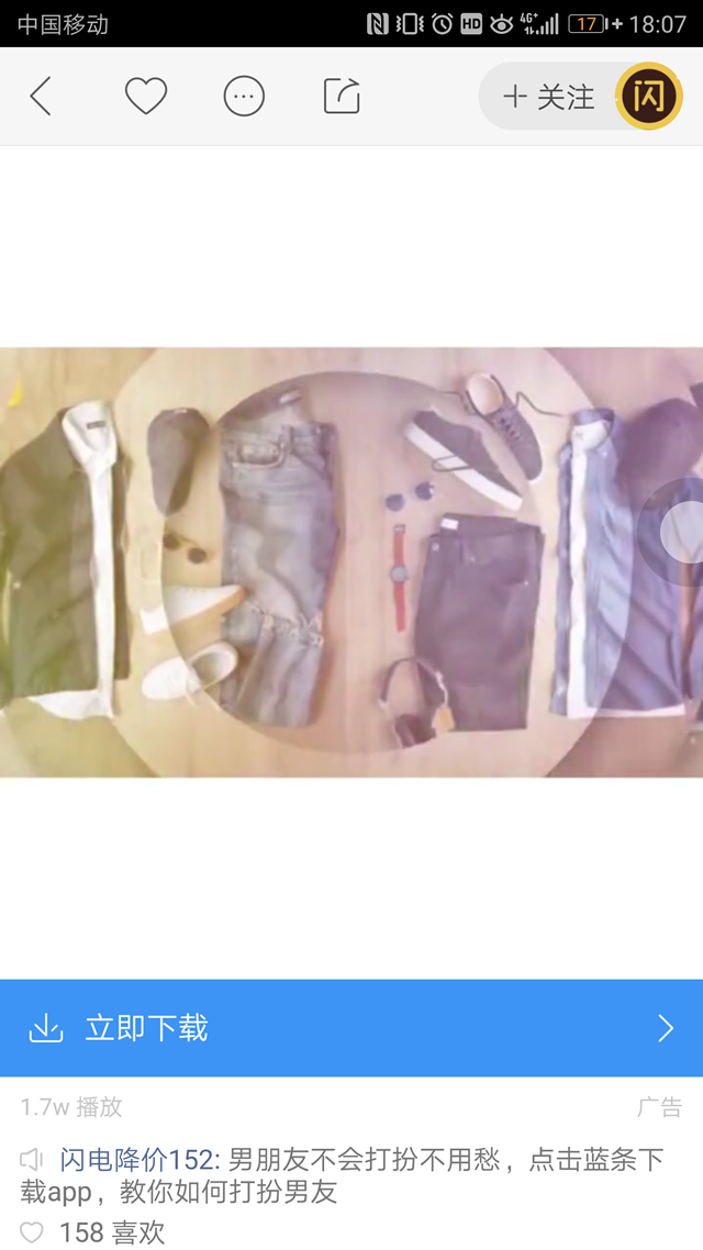 不管我们在什么平台上做广告推广,最重要是从用户和平台属性出发,闪电降价的也是这样做的! 男生大多是搭配黑洞,所以这里的广告创意就是从男生的搭配出发。“如何打扮你的男朋友”在这里是有情节描述的,男生不会搭配,这时候女友上线帮忙搭配,如果女友也没有好的搭配案例怎么办?当然是上闪电降价啦! 用户在看到快手广告时能够看到的广告元素就是品牌主头像、广告文案、广告创意视频和“广告”字样。 当我们确定要看广告视频以后,需要点击广告封面: