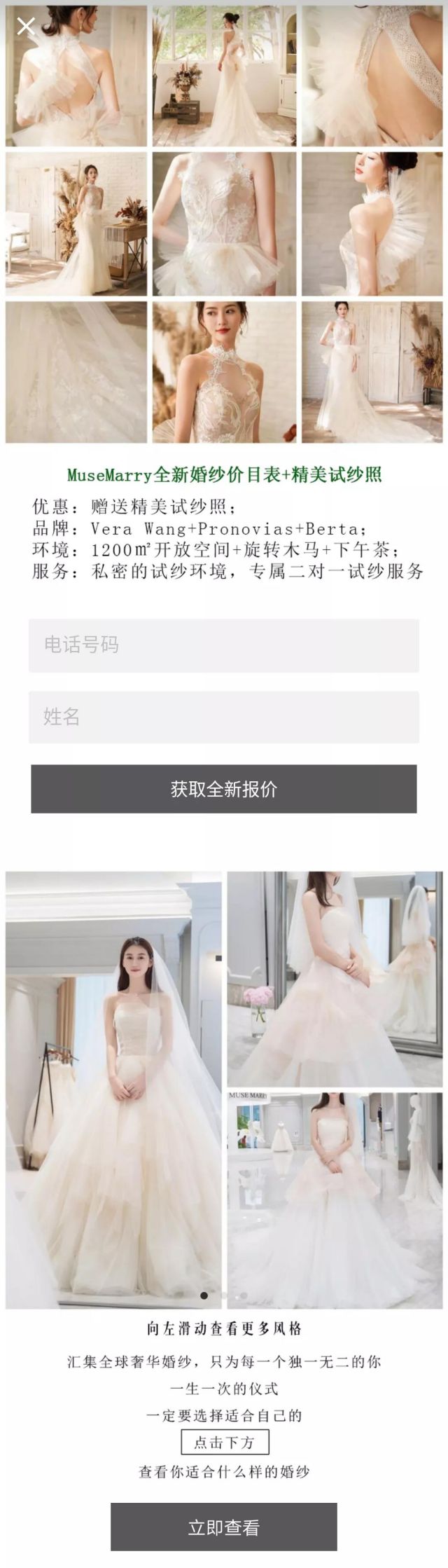 多样产品展示+多个收集信息按钮,获取更多客户 挑选婚纱是个费事费力的过程,新娘们都期盼那件让自己眼前一亮的婚纱早点出现,并希望婚纱礼服店可以提供更多类型的婚纱进行挑选,MuseMarry在落地页中通过展示多种婚纱礼服满足了用户的这个需求。 为了更好的促进用户留下信息,MuseMarry在落地页中通过强调活动信息、报价单以及优质高端的环境和服务吸引高意向用户留下电话及姓名。不仅如此,为了收获意向不强的潜在用户信息,优化师还建议MuseMarry使用“小测试”引发用户的好奇心,在测试页面收集更多客资。