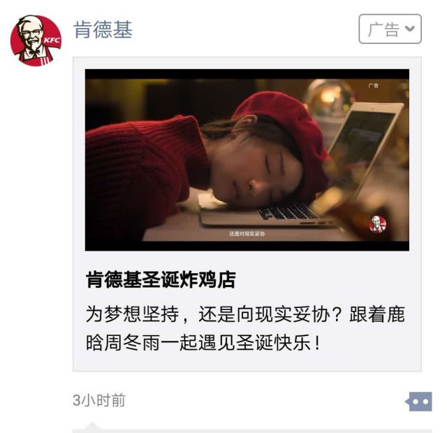 也许之前的圣诞节没什么好玩的,但是今天的圣诞节你也有你的专属,就是肯德基圣诞炸鸡店! 每一个在异乡打拼的人,都是为了梦想,但是随着年龄的增长,我们究竟是应该继续坚持还是向现实妥协,向家庭妥协呢?无论你的答案是什么,小编都会支持你的选择,但是只要现在做的决定不后悔即可! 广告创意是一个小视频,视频内容带你打开圣诞节的正确方式,也许你疲惫宣传海报word不堪,也许你一个人独在异乡,但是没事,今年的圣诞节我们和鹿晗周冬雨一起欢度圣诞节! 点击广告以后,广告会进入落地页: 落地页上方是所有的视频内容,落地页下方就是活动内容介绍、活动参与方式等等,这就是最常见的活动推问答营销公司广方式。 节日营销大品牌们最喜欢玩的招数,所以无论是大品牌还是小品牌在圣诞节这天,只要能够找到节日和产品的一个连接点,将连接点不断放大,打造内容爆点,让用户之间产生传播也是很容易的!