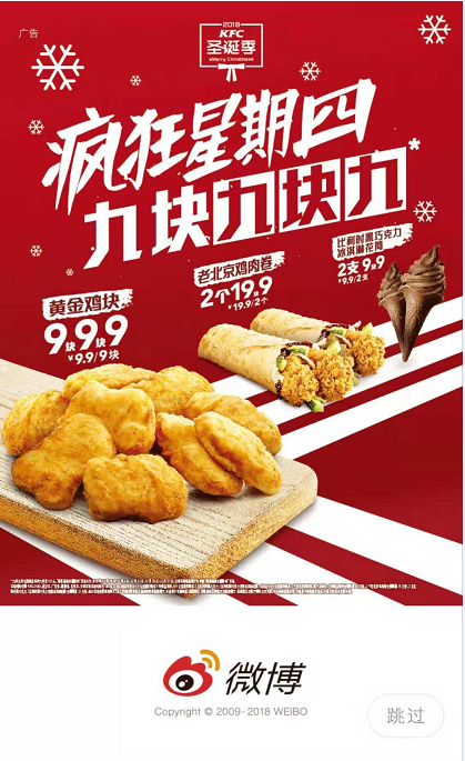 一年一度的圣诞节即将来临了,很多商家都已经开始了预热活动,就比如大家所熟知的肯德基。 肯德基在圣诞节到来之际,选择在微博投放开屏广告。广告配色吸睛,背景图是一王老吉危机公关ppt张红色有雪花图案的图片,符合节日气氛,又与品牌相关,文案部分用白色大字突出活动主题。广告用了3个低价产品作为广告卖点,吸引消费者注意。广告文案部分标注清楚活动时间,每周四,用户可以低价购买这些产品。