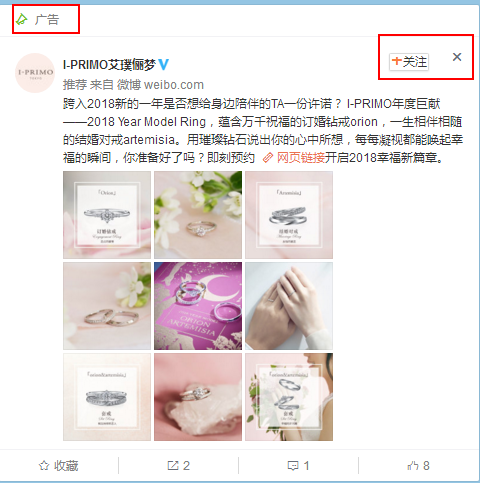 微博的广告案例超多的!记不清这是第几波了,但是嘞,该分享的微博粉丝通广告案例,小编还是照分享不误的! 这次是艾璞俪梦投放的微博粉丝通广告! 艾璞俪梦是一个来自于日本的小众轻奢婚戒品牌,艾璞俪梦也可以为新人私人订制款(现在的年轻人更喜欢私人订制)。