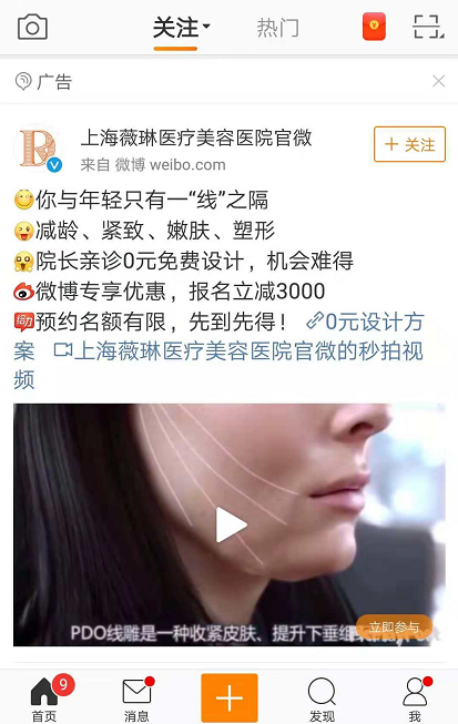 上海薇琳医疗是REDREAM医疗集团旗下高端医疗美容机构连锁品牌之一,始于美国旧金山未来研究中心。 20年来,薇琳一直致力于对整形技术的极致追求和探索,在美国、韩国等多个国家及地区均设有高端医疗美容机构。 此次上海薇琳医疗美容医院投放微博朋友圈广告,主打年轻,紧致、嫩肤产品,广告创意用“院长亲诊,0元免费设计”、“报名立减3000&r公关危机期末考试dquo;等,吸引目标用户注意。广告视频部分详细介绍了这种产危机公关处理案例高露洁品,让用户更心动。用户点击链接,填写个人信息,即可获得0元设计方案。 医美行业投放微博广告,可以将广告精准推送给目标用户,结合广告创意,增加粉丝数量。投放微博罗德公关北京粉丝通广告,广告主客服可以与目标用户进行互动,并实现转化。而且这些主动关注账号的粉丝,存留度高,活跃度高。