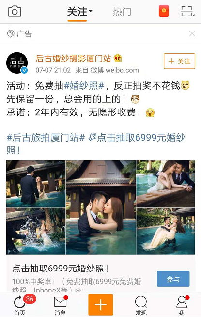后古婚纱摄影是源于厦门的一个婚纱摄影品牌,凭借精湛的技术实力和不断创新的理念成为行业内备受好评与追捧的标杆性婚纱摄影品牌,为热爱时尚,追求个性的年轻人量身定制专属的婚纱照拍摄方案。 后古婚纱摄影此次投放的微博广告,抓住出海部了消费者“不要白不要”的心态,文案部分介绍活动内容,“免费抽婚纱照”、“无隐形收费”等字眼直击用户内心,消除用户担忧。图片部分向大家展示了一组非常唯美的婚纱照片,吸引用户眼球。图文结合,更有说服力。用户可以点击下方按钮进入落地页,参与抽奖活动。 用户可以根据自己的推广需求设计落地页链接,微博粉丝通广告支持各种形式的广告推广。广告主可以在评论区与粉丝互动,拉近用户距离。粉丝通广告投放具有定向功能,广告主可以根据用户的性别、年龄、地域等属性进行筛选,把广告准确投放给目标受众人群。