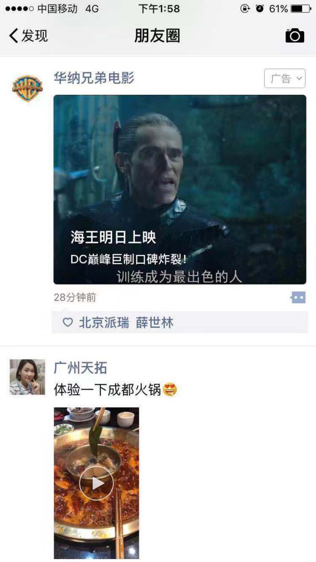 之前,我们说《海王》大电影在上映之前,投放了爱奇艺广告(),但是就在今天,他又再此投放了微信! 《海王》是在明天上映,国内大小影院都是可以直接观看电影的! 所以今天就有华纳兄弟电影为了蹭一波热度,就通过《海王》在微信朋友圈广告做了借势营销! 广告外层文案是这样滴: