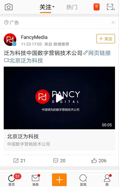 此次北京泛为科技投放的微博广告,主要是为了企业做宣传。广告文案与视频相结合,符合整合营销成功案例用户阅读习惯。文案部分放上公司名称以及网站链接,视频部分展现了品牌logo和公司名称,相对而言广告素材过于精简。 微博用户数量大,投放微博粉丝通广告,可以全面覆盖PC端和移动端的用户,广告曝光效果好。但是一个粉丝通广告有好的广告素材可以为广告更加分,建议广告主在投放广告时注意一下几点: 1.有创意的文案 抓住品牌或产品推广的重点,可以是产品功能介绍,品牌理念传播,优惠活动介绍等等。或者利用当下的热点内容进行推广,例如热点话题、明星八卦、热门事件等,利用这些热点来抓住用户的眼球。 2.精美配图 精美的配图能很好的吸引用户的注意力,还能为文案增色不少,视频也一样。 3.合适的落地页 落地页是广告转化的关键,根据推广需求设置落地页非常重要。