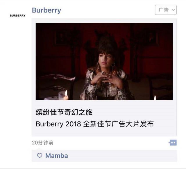 广告外层文案如上图: 广告文案就是关于缤纷佳节奇幻之旅(主要是指圣诞节),主要就是宣传Burberry的这支广告! 广告落地页就是沉浸式落地页,落地页就是广告视频的全部内容,没有引导用户的关注,也没有跳转官网等等。 所以我们可以判定为,这次广告主的推广目标就只是品牌曝光,并且在用户之前引起强烈的互动分享和传播! 为什么这么多的大品牌都选择投放微信朋友圈广告呢? 1.微信朋友圈拥有优质流量,而我们要做的就是把握优质流量,并把这些流量发展成自己的潜在客户公关危机的基本原则; 2.微信朋友圈广告按照曝光收费,用户在广告页面停留五秒以后才会计费,对于广告主投放广告,有一定的保障性,并且是可以指定区域进行广告投放的,所以我们可以把广告投放给最精准的目标用户。