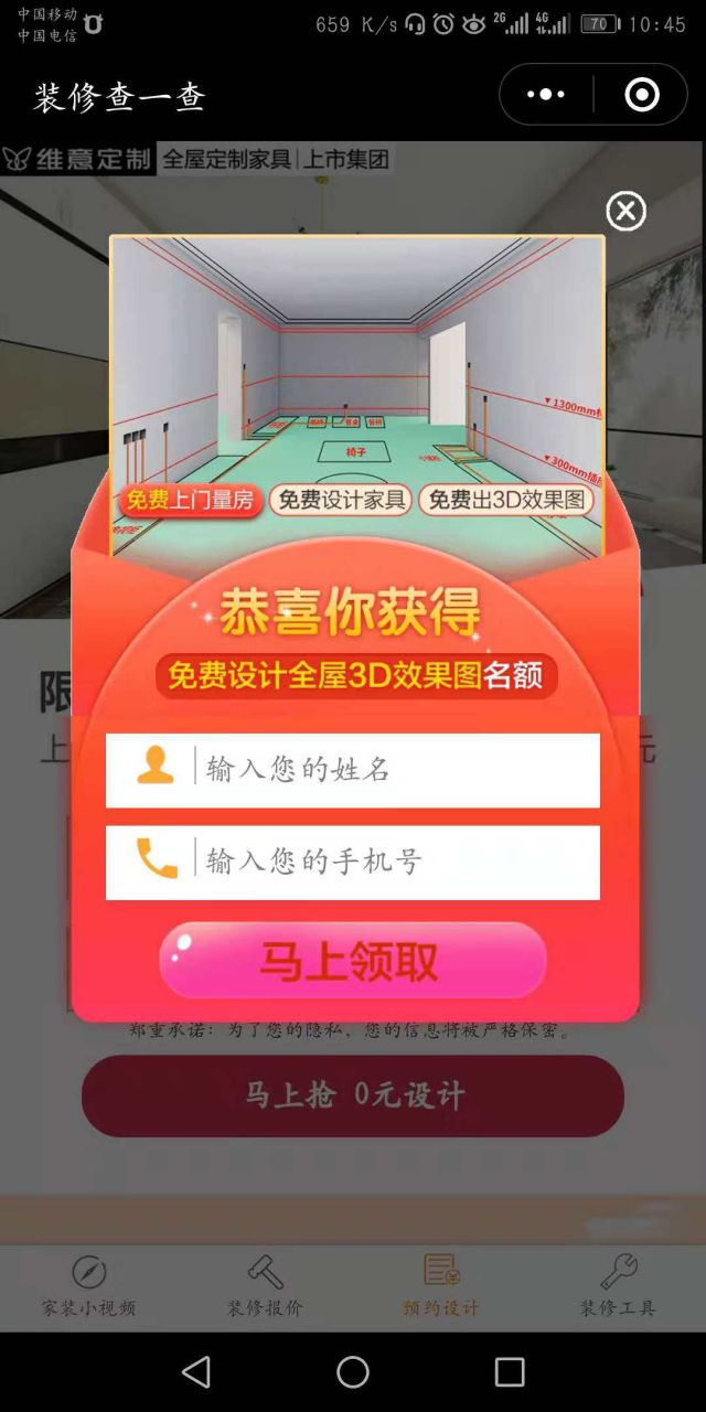 点击以后,会先有个弹窗。用策划营销方案案例户可以通过预留自己免费的信息发布网信息来获取免费设计名额! 点击关闭以后,我们就可以根据自己所在城市,依据户型大小来获得报价了! 以上就是维意定制在微信投放的家装行业小程序推广!如果你也想要在微信朋友圈里推广自己的小程序,就赶紧联系我们吧!