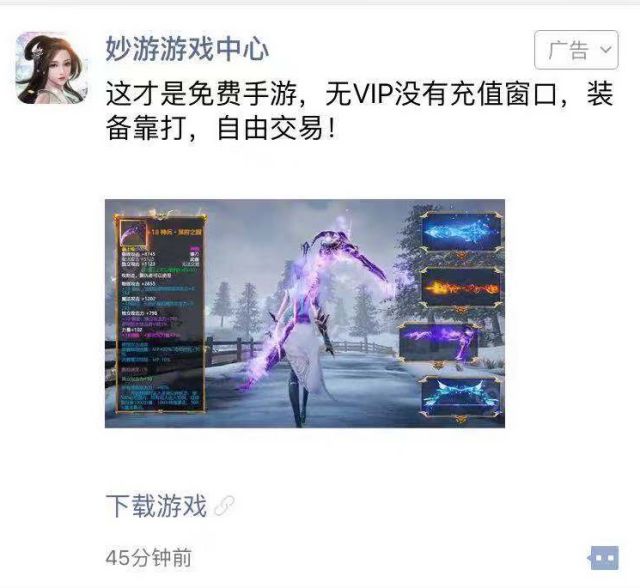每天醒来第一件事,打开手机—微信—朋友圈,看看大家更新的动态,当然最重要的还是看看今日份的微信朋友圈广告是谁投放的! 今天,要分享的是妙游游戏中心投放的微信朋友圈游戏广告! 妙游游戏中心是一个游戏网站,网站里面有很多的免费手游,如果是游戏沉迷者,建议可以去妙游游戏中心看看,说不定你会找到让你爱不释手的游戏哟~ 广告案例每天都有更新,大家走过路过千万不要错过,赶紧来看一看!