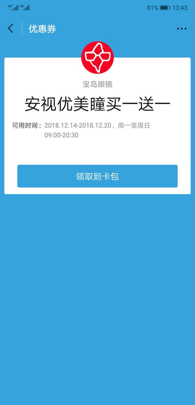 小编觉得这个广告还是很不错的,查看卡包,我们就可以看到宝岛眼镜的优惠券! 如果不知道哪里有宝岛眼镜店?没事。点击适用门店,就可以查看距离你最近的宝岛眼镜店在哪里~ 并且,我们还可以把优惠券转送给朋友,除此之外,我们还可以关注宝岛眼镜的微信公众号,关注品牌的产品更新信息、优惠活动!