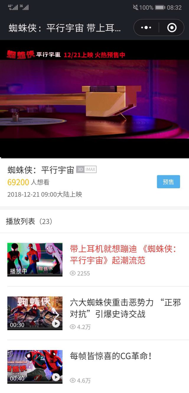 点击广告以后,我们就可以看到的就是蜘蛛侠的精彩预告,然后通过广告主推广的小程序也能做整站够进推广营销需求行直接购票,这就是这次投放的广告所在的神奇之处。 呐,人家有影视剧要上线,都会投放微信朋友圈广告,爱奇艺广告,都会做,你还在等待什么?