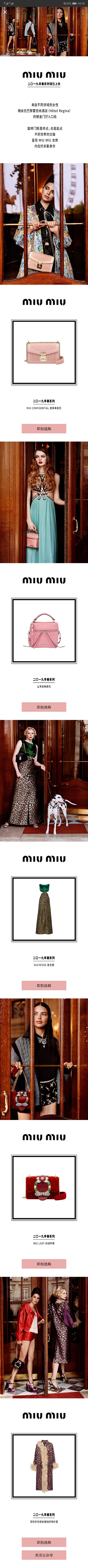 广告落地页是广告内容的精华~ 在广告落地页中,那个旋转门体现了它的神奇之处,旋转门处于巴黎雷吉纳酒店的镀金门厅入口,在这里汇聚了不同领域不同国家的女性,这个旋转门就是大多数女性的时尚大门的入口,也是不同世界的交融,通过miumiu女郎也能够完成不同身份的转变。 在落地页里就是品牌产品的单品介绍、有单肩包、连衣裙、手袋、外套等等。我们可以通过这个落地页进行产品的构面,也可以关注企业的微信公众号。 在落地页里设置收割按钮“即刻选购”和“关注公众号”,可以帮助广告主完成两个推广目抖音如何做推广标: 1.“即可选购”是对产品B站广告的线上订单转化; 2.“关注公众号”是可以完成品牌曝光的推广目标,点击按钮就可以进入企业的官方微信公众号。