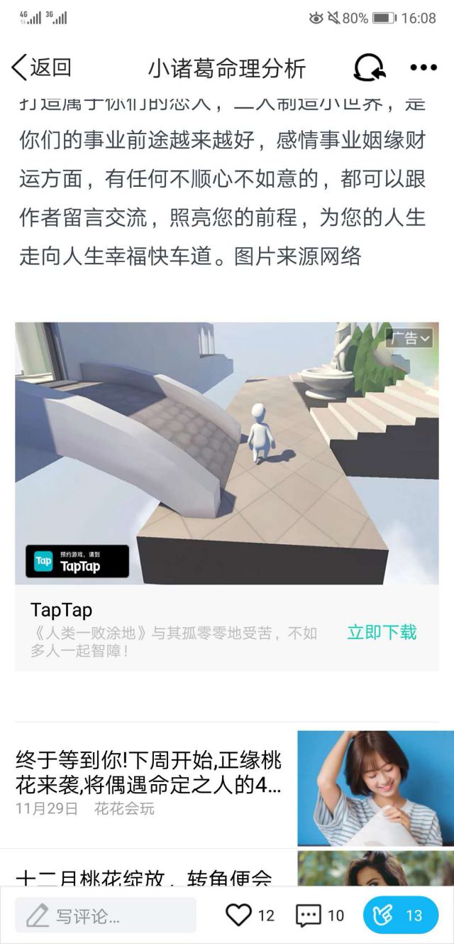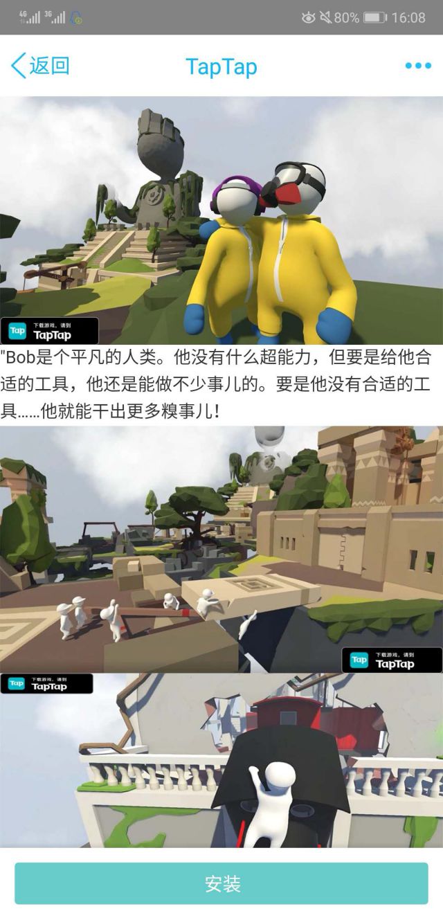 上图是他投放的广告案例截图,但从图片来看可能没有大多实质性内容,小编猜测图片可能是游戏场景图(仅为猜测)。广告文案是《人类一败涂地》,这里的《人类一败涂地》是一个游戏,广告主TapTap是想推广《人类一败涂地》的游戏,在广告文案旁边有“立即下载”就可以直接下载游戏。 在大多数时候,图片不清楚,不怎么能让人明白其内容是什么的时候,所以我们会点击图片,点击图片以后,我们会进入以下图片: