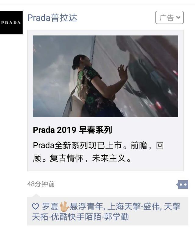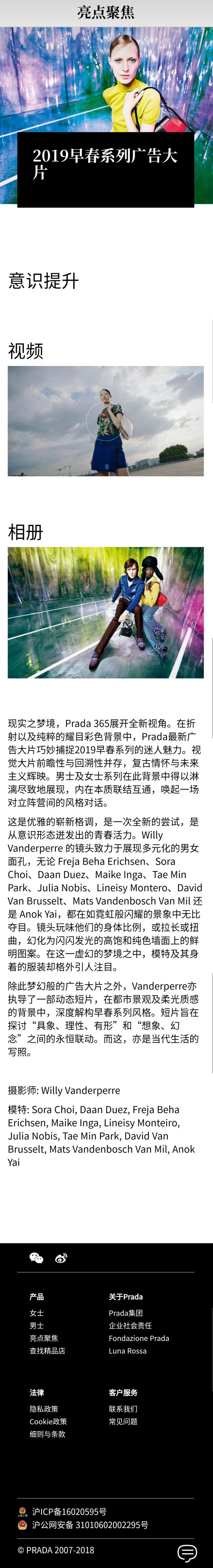 广告内页最顶部的就是一个视频 视频就是Prada普拉达的2019年早春系列的广告大片,大牌的广告都是蜜汁好看! 落地页中就是关于品牌的介绍,在落地页底部也有一些按钮,通过这些按钮,我们也可以了解更多关于Prada普拉达的信息。 Prada舆情培训普拉达投放的微信朋友音乐餐吧宣传海报圈广告就是这样,一般大牌都是引领潮流,所以不得不承认Prada普拉达投放的广告是较好的,在2018年年尾的时候就已经引流2019年初的潮流! 在这里,小编有一个小小的建议。就是在落地页中,也可以吸引用户关注微信公众号,这样会更有助于用户了解新品上市,也更有助于企业发展维护新老客户。