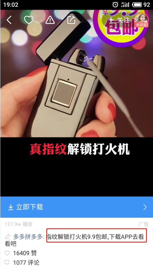 此次拼多多在快手广告平台投放的广告是一款指纹解锁的打火机,只要9.9元,而且还包邮。拼多多是以人为先的新琼海小程序电商开创者。在以人为先的理念下,拼多多将娱乐与分享的理念融入电商运营中:用户发起邀请,在与朋友、家人、邻居等拼单成功后,能以更低的价格买到优质商品;同时拼多多也通过拼单了解消费者,通过机器算法进行精准推荐和匹配。