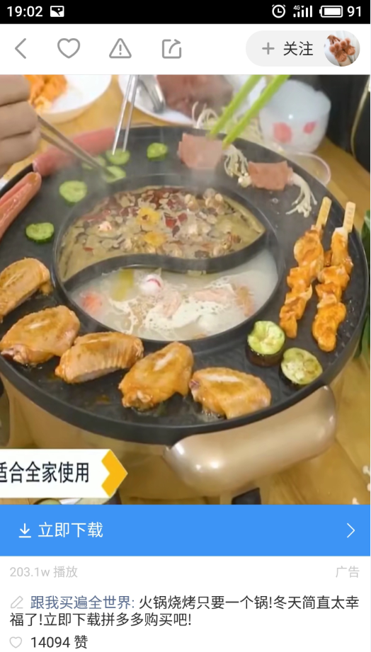拼多多这次在平台上投放的广告就是以火锅味切入点,选用了当下时节最受欢迎的火锅烧烤一体锅作为广告主打产品。拼多多此次投放广告的目的是为了推广APP,增加APP用户数量。拼多多主打的是低价策略,相对而言,用户群体更偏向于三四线城市及以下的消费者。