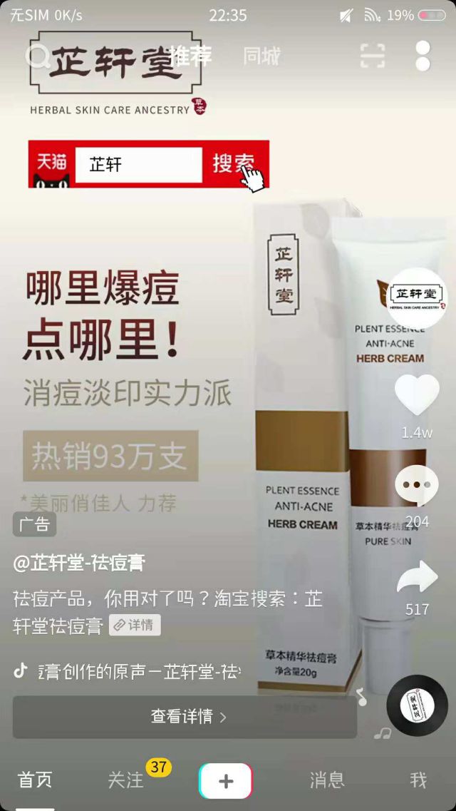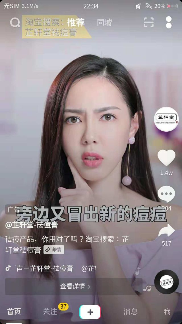 青少年怎么战痘?当然是选择芷轩堂祛痘膏!最近啊,芷轩堂祛痘膏在抖音上火的不要不要的,那么芷轩堂祛痘膏是怎么火起来的呢? 当然是投放抖音广告! 抖音广告带火了哪些行业?餐饮!游戏!婚纱摄影!电商!(如果有广告主从事这些行业,并想要投放抖音广告的可以和上海取得联系) 小编每天闲暇时间喜欢刷刷抖音,所以就刷到了芷轩堂祛痘膏广告,一起来看看吧~