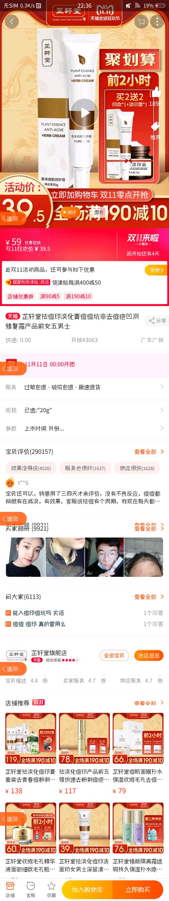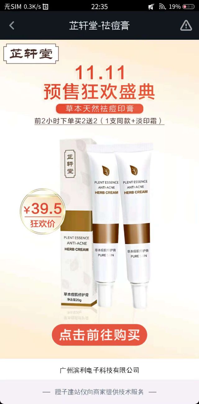 点击广告以后,进入的是芷轩堂祛痘膏详情页,用39.5底价来吸引用户购买,并且还有“前2小时下单买2送2”的优惠来让用户进行购买。广告落地页中,再次用价格优势来让用户产生下单行为。从广告学的角度来说,大多数用户看到广告时,不确定自己是否需要否买时,是需要一些关键词来引导用户购买的。在这个落地页中,就有明显的体现,比如“点击前往购买”。 外包营销团队