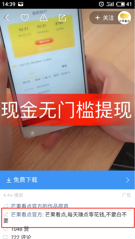 “看资讯,领现金红包”,看到这,是不是有很多人不相信呢?但这确实是真实的,小编在平台看到芒果看点app投放的广告展示看资讯就可以领现金红包。