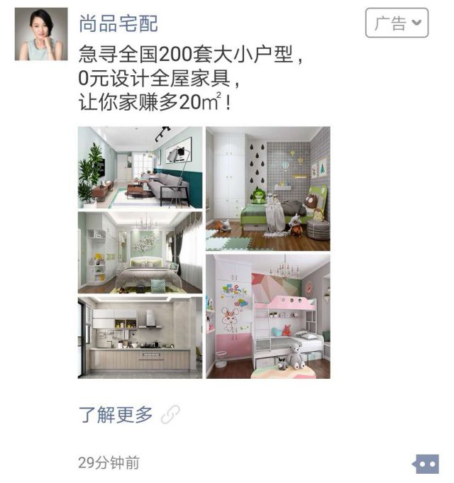 广告案例如上图,上图中是五个不同户型的家具搭配成品图,小编最喜欢右上角的哪一张(比较百度危机公关喜欢绿色的)! 从广告图片就可以看出不同的房间类型,应该采用不同的家具搭配,并且采用的色系也都不一样。比如卧室用浅绿色,儿童房就采用粉色系,厨房采用简单大气优雅白等等。 尚品宅配此次投放的微信朋友圈广告,无论我们是点击【了解更多】还是点击广告图片,都会直接进入广告主的推广链接。广告主的推广链接如下:
