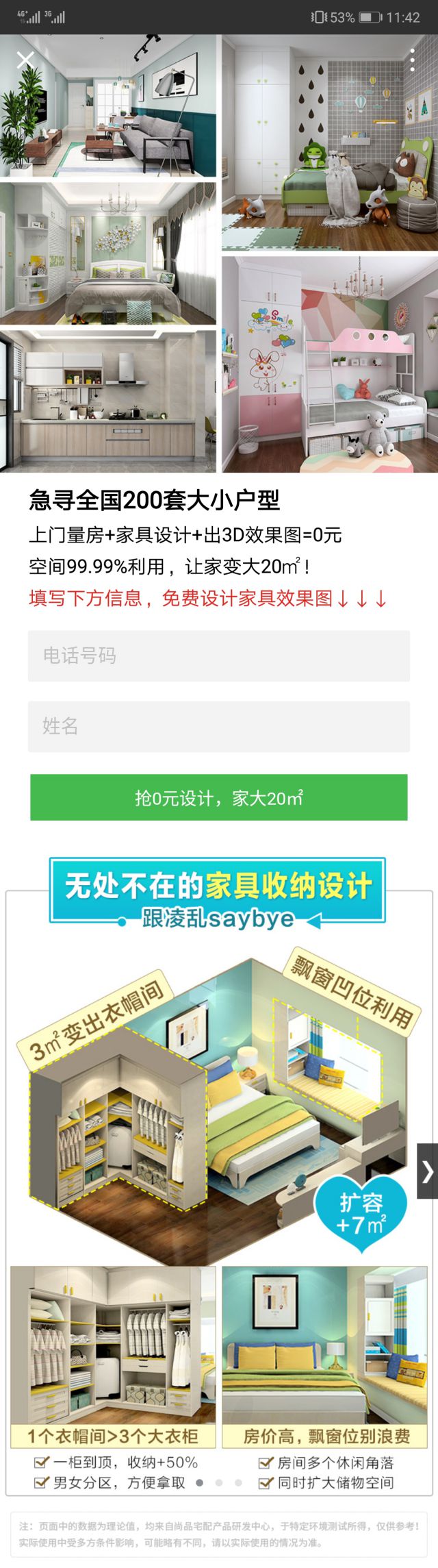 落地页的内容跟外层广告差不多,上面是家装搭配成品图,文案中最大的亮点就是“上门量房+家居设计+出3D效果图=0元”,也就是说如果我们留下联系方式,上门量房+家居设计+出3D效果图全是免费的,还能够拿刀免费 的设计家具效果图! 在落地页的下班部门 ,会跟大家简单讲述家具收纳设计的一些技巧性内容,也跟大家讲了是如何扩充房间空间的! 的整个流程体验都还不错,所以说,公司代运营公司如果大家有需要家装家具可以选择尚品宅配,如果是有自己的家装品牌也可以选择微信来做推广。
