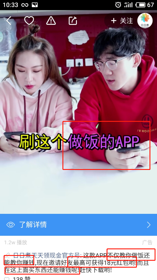 快手广告通过对日日煮APP的了解,为它设计了以学做饭还能赚钱为主题的广告视频。视频中通过两人对话的方式,向大家传达产品功能,这是一个做舆情监控饭的APP,同时勾起用户制作宣传片用什么软件好奇心;还提到刷这个APP可以赚钱,购物还可以省钱,并向大家展示出来。字幕突出,加深用户印象。