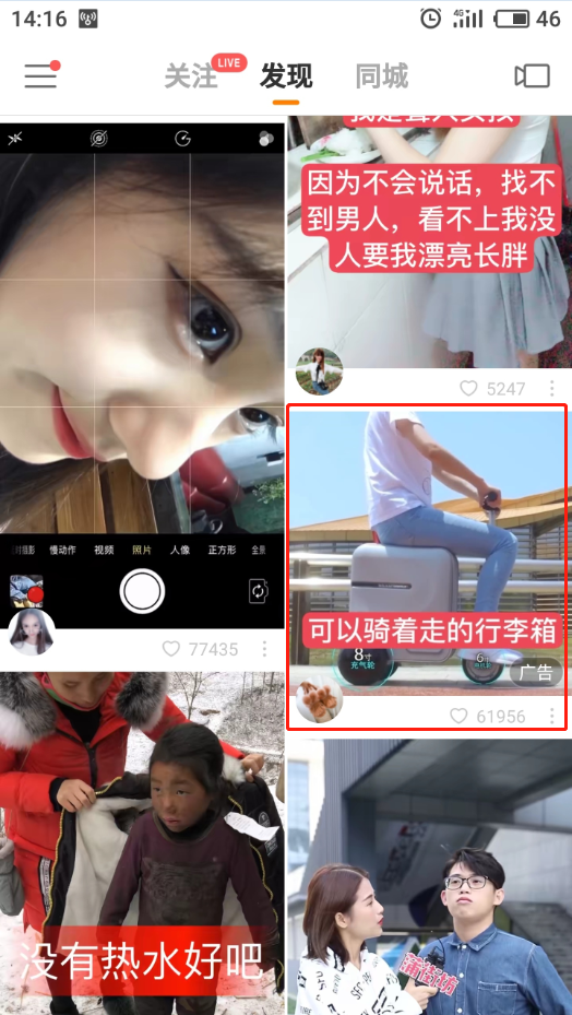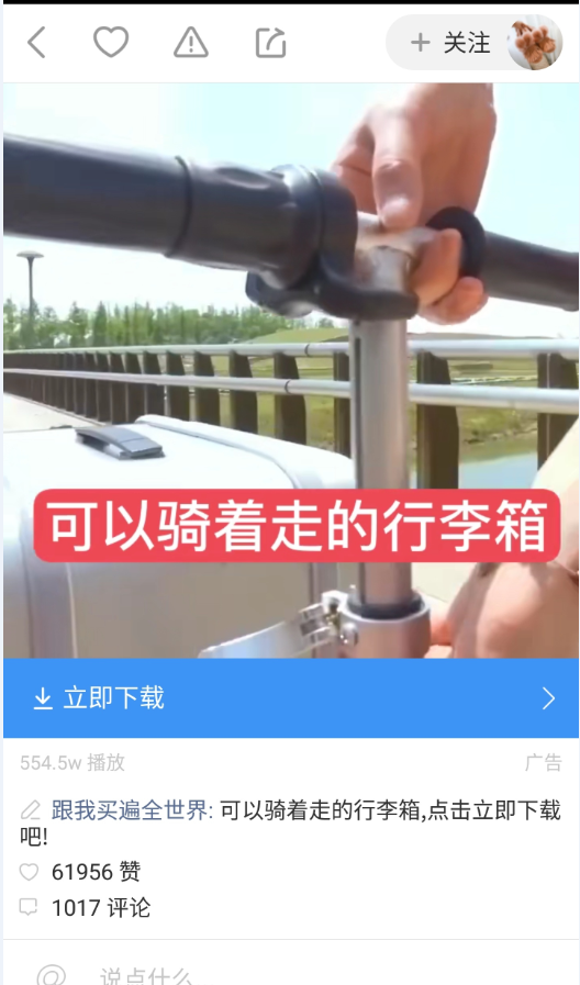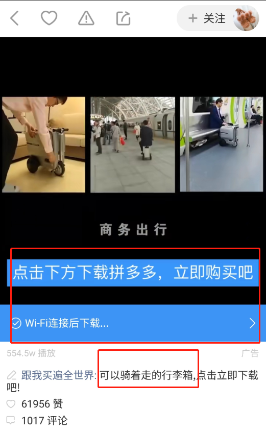 平传统数字营销台上就有这样一则广告,这是拼多多在快手广告平台投放的以“可以骑着走的行李箱”为噱头的APP推广广告。广告产品新颖,对用户非常有吸引力。