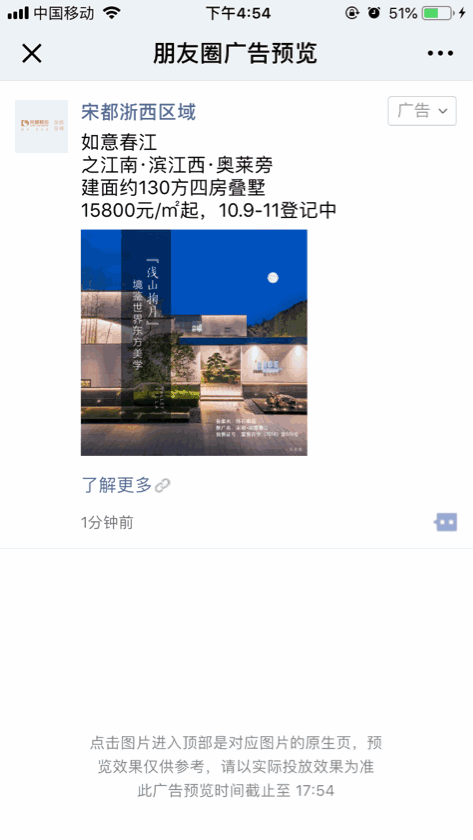 广告整体风格与楼盘建筑风格相得益彰,品宣效果事半功倍 搭配表单组件便于收集意向用户信息,实时跟进用户转化 投放地域选择西湖区、滨江区等周边区域,广告投放有的放矢 楼盘新推在即,宋都如意春江以作为品宣渠道,率先在朋友圈营造声势。“之江南,滨江西,奥莱旁”,充分利用地标性建筑类比,9字形象勾勒出楼盘位置。通过文案与画面,广告外层初有什么视频没有广告步形成地段好、价格优、独具风格的楼盘印象,自然更吸引用户。 广告内层承袭建筑风格,呈现一种山水禅意的意境,搭配别墅组图,充分展现别墅地理位置、户型等多维度信息,设计美感与广告兼具,提升用户的广告体验。