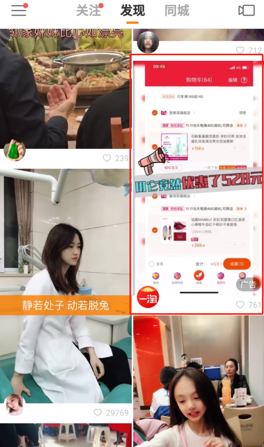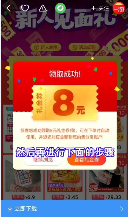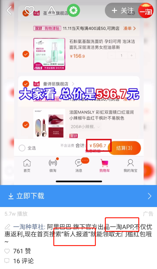 一淘此次在快手的广告采用对比的形式,展现出使用一淘前后商品所付价格的变化,让用户心动。而且视频中向用户展示了操作步骤,新人下载APP,搜索“新人报道”还可领取8元新人红包,下单就可使用。