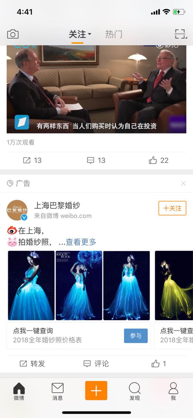 以前我们看到微博的婚纱摄影广告都是博文形式,而这次小编看到的微博广告是轮播形式的。 这次投放广告的广告主是上海巴黎婚纱。上海巴黎婚纱能够给大家提供写真照、婚纱照以及全球旅拍等服务,有需要拍摄婚纱照/写真照的可以找上海巴黎婚纱哟~